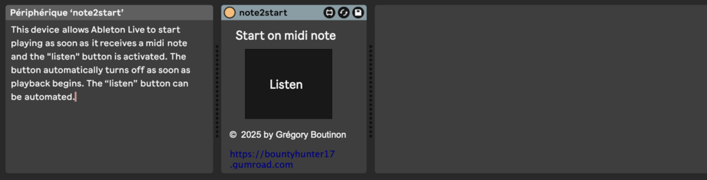 This device allows Ableton Live to start playing as soon as it receives a midi note and the "listen" button is activated. The button automatically turns off as soon as playback begins. The “listen” button can be automated.